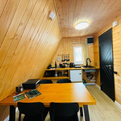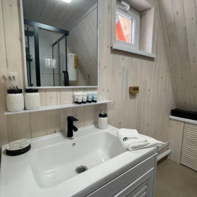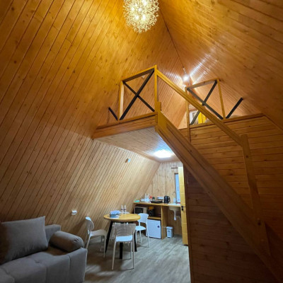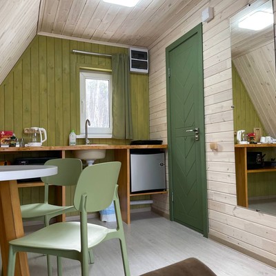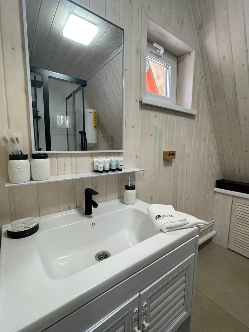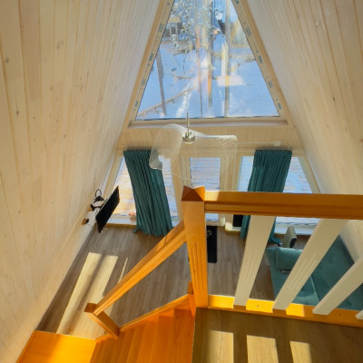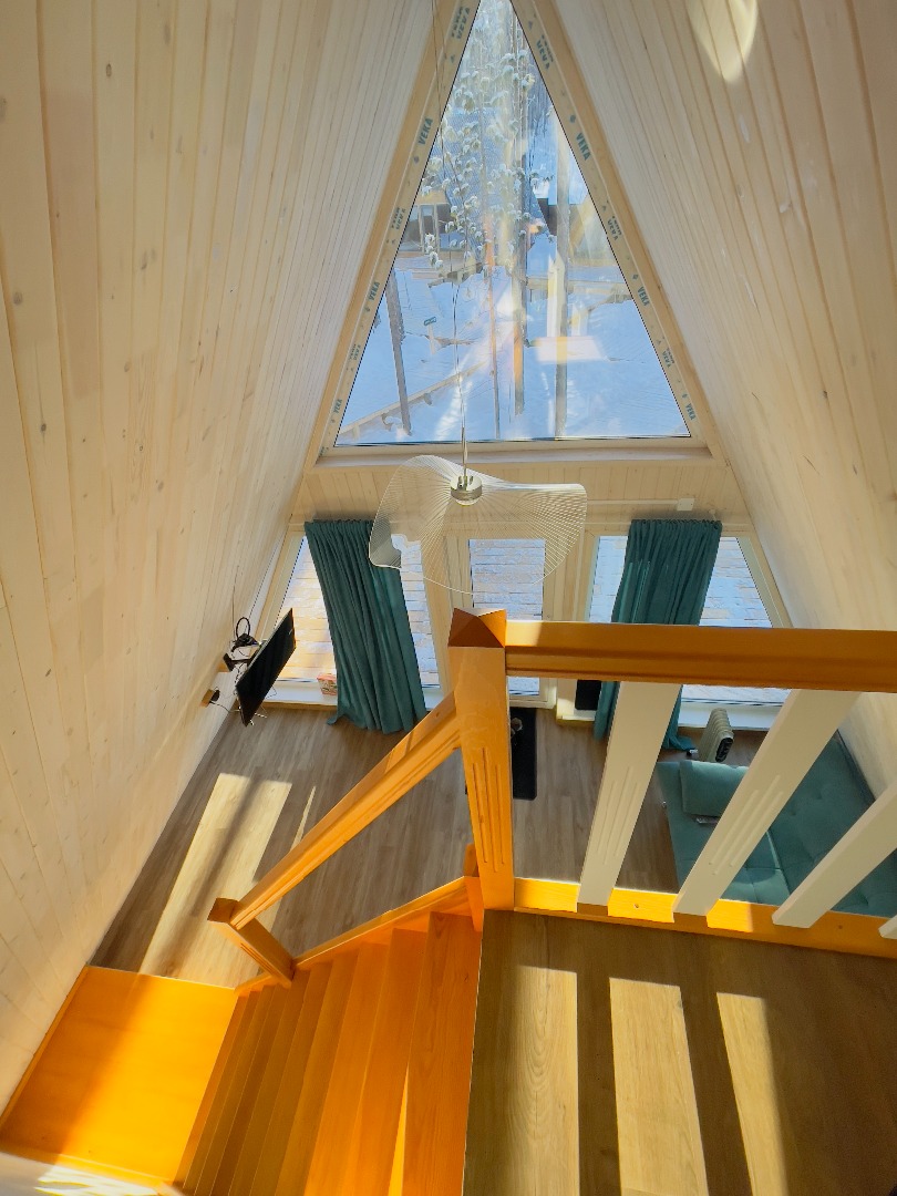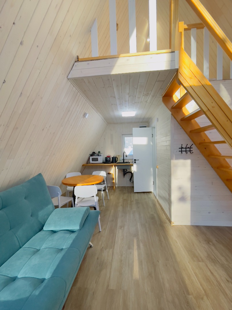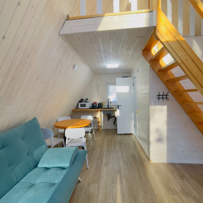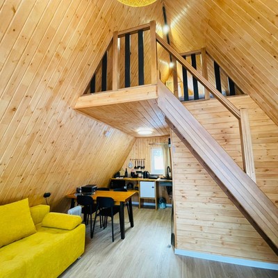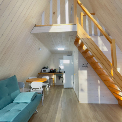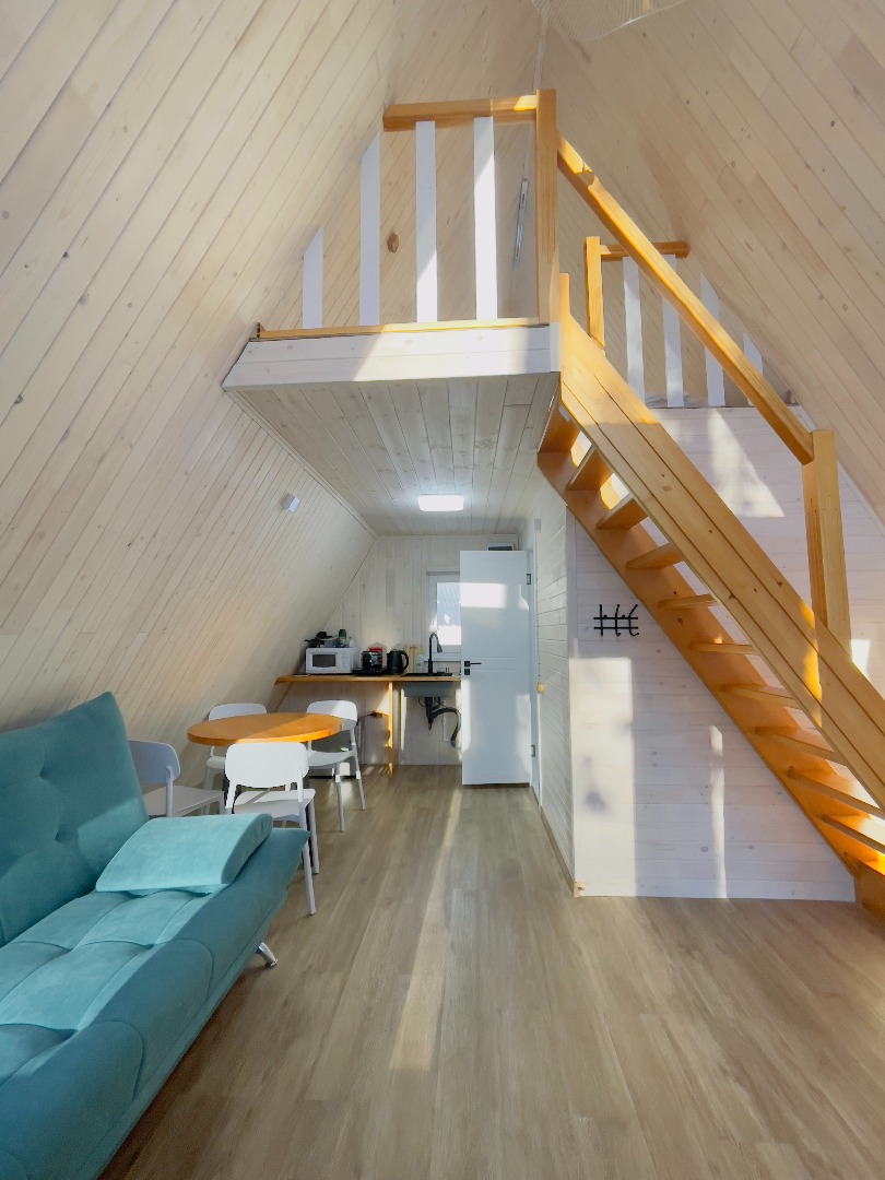 В отеле 12 уютных двухуровневых треугольных домиков А-фрейм с панорамными окнами. Все домики с теплыми полами и индивидуальной террасой. Выполнены из натурального дерева по современным технологиям. На первом этаже расположены гостиная и ванная комната, на втором этаже - спальня. В наличии микроволновая печь, минихолодильник, чайник. В ванной - косметические и гигиенические принадлежности. В гостиной зоне - удобный раскладной диван, ТВ. В спальне на втором этаже - две раздельные кровати с возможностью соединить в одну большую семейную кровать. На открытой террасе деревянные кресла. Также в каждом домике вас ждет высокоскоростной вайфай и смарт-тв.