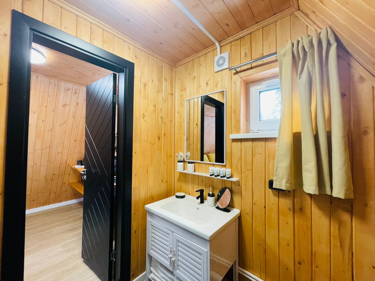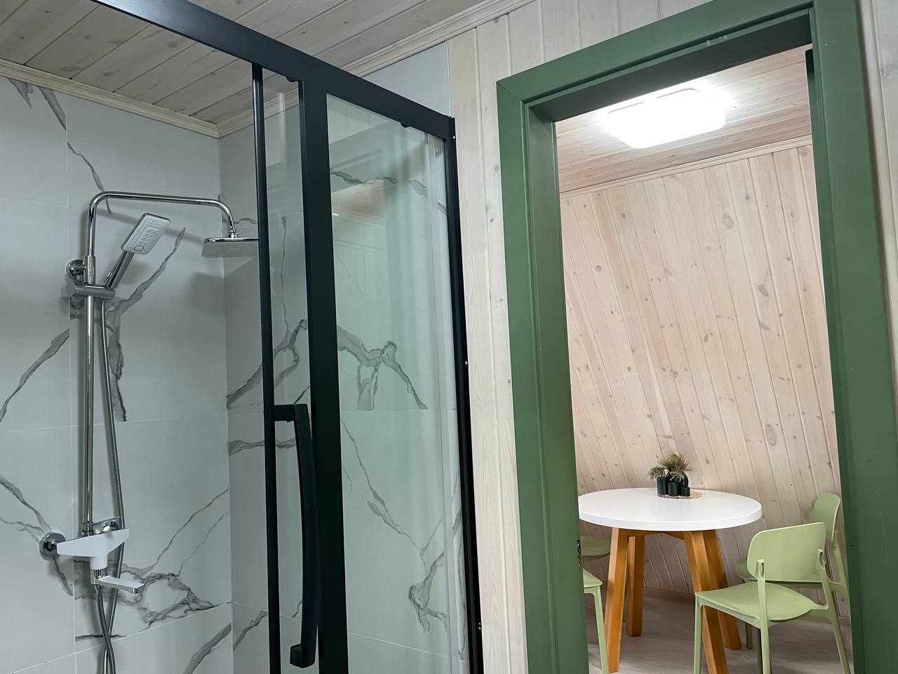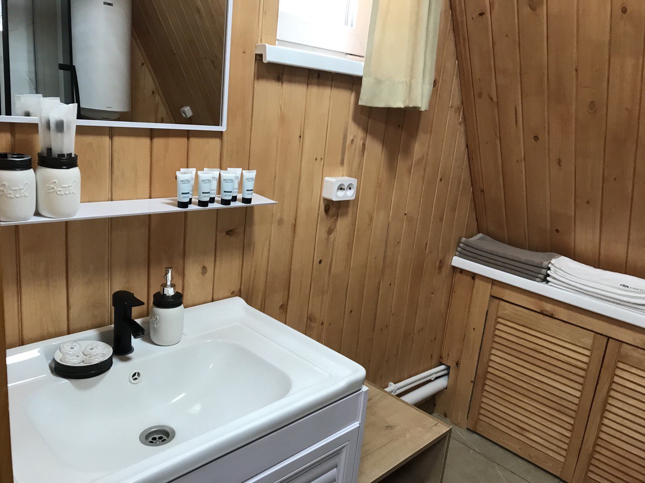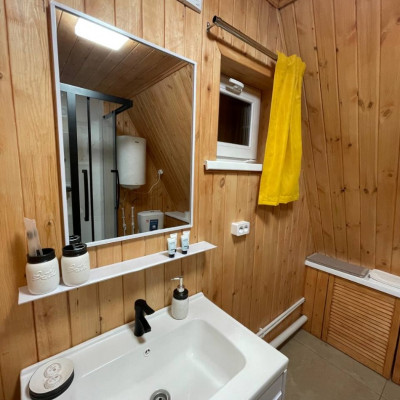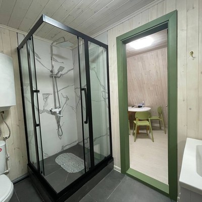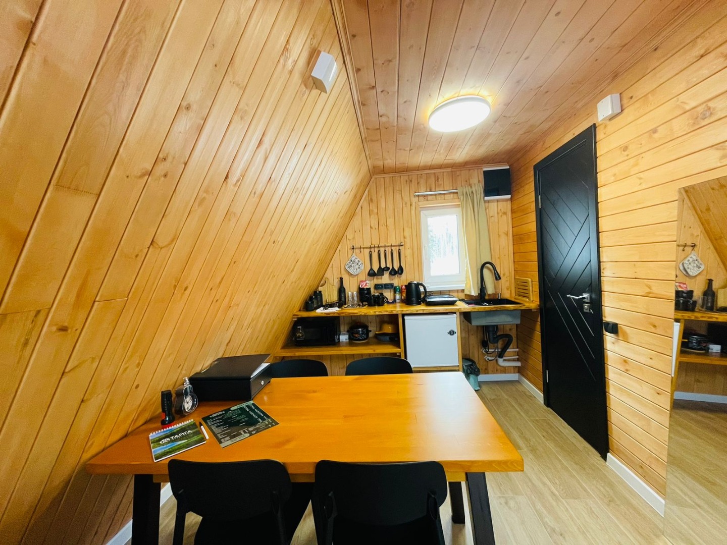 В отеле 12 уютных двухуровневых треугольных домиков А-фрейм с панорамными окнами. Все домики с теплыми полами и индивидуальной террасой. Выполнены из натурального дерева по современным технологиям. На первом этаже расположены гостиная и ванная комната, на втором этаже - спальня. В наличии микроволновая печь, минихолодильник, чайник. В ванной - косметические и гигиенические принадлежности. В гостиной зоне - удобный раскладной диван, ТВ. В спальне на втором этаже - две раздельные кровати с возможностью соединить в одну большую семейную кровать. На открытой террасе деревянные кресла. Также в каждом домике вас ждет высокоскоростной вайфай и смарт-тв.
